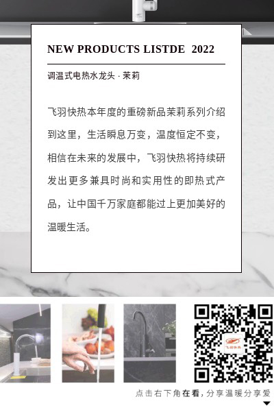 飛羽快熱本年度的新品茉莉系列重磅來襲!生活瞬息萬變,溫度恒定不變,相信在未來的發展中,飛羽快熱將持續研發出更多兼具時尚和實用性的即熱式產品,讓中國千萬家庭都能過上更加美好的溫暖生活。