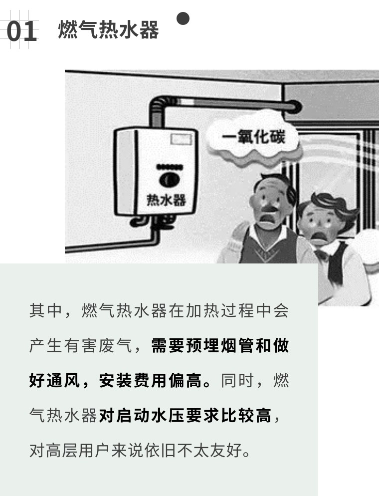 燃氣熱水器必須裝在空氣流通的地方,對于安裝位置的限制性比較大。但這樣就會與浴室距離較遠,形成較長的冷水段,每次使用時都得將冷水段里的冷水全部排光才能出熱水,極易造成水資源浪費。