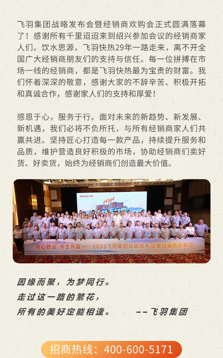 2023飛羽經銷商大會在紹興圓滿落幕,感恩于心,服務于行,我們與所有經銷商家人們共贏共進。